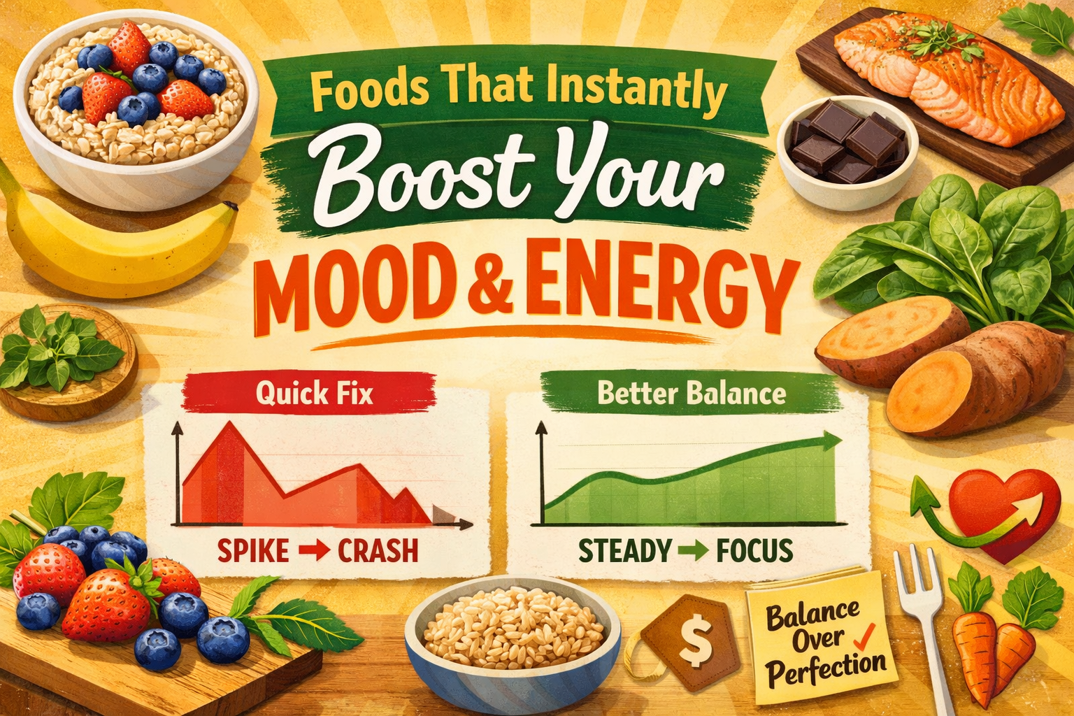 Simple, affordable foods that boost your mood and energy naturally. Includes vegan options and realistic tips — no strict diets required.